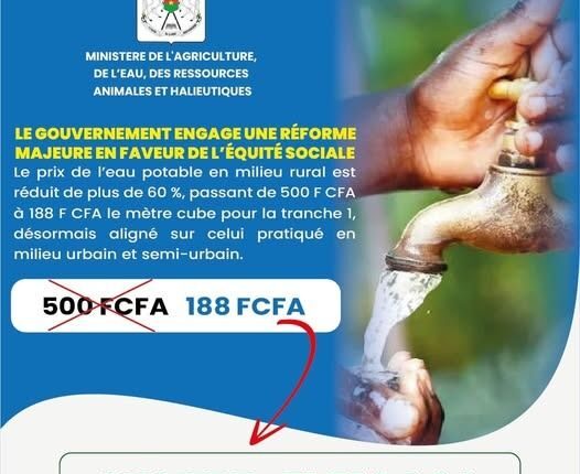 Selon les autorités, le prix du mètre cube d’eau en milieu rural connaît une baisse significative de plus de 60 %. Il passe ainsi de 500 F CFA à 188 F CFA pour la tranche sociale, rendant l’eau potable plus accessible aux populations rurales.